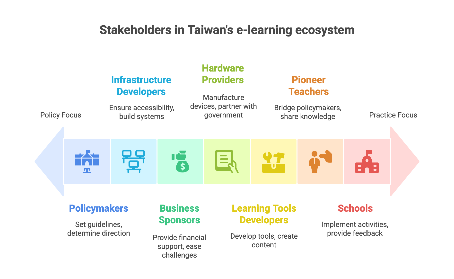 After the initial research, the study has identified seven stakeholders in Taiwan's e-learning ecosystem. The following summary provides a condensed explanation of each role.